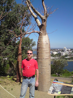 Изгорях нечовешки на тениска и слънчеви очила докато бяхме на фотолов за кенгура на о-в Heirisson (кенгурата си живеят там свободно, аз докоснах едното от тях по опашката!) и след това в парка Kingspark - огромен парк над града, където видях (ей, забравих да го докосна да видя как е на пипане!) баобаб. Истински, от Своге. Листата на баобаба окапват до едно през сухия сезон.