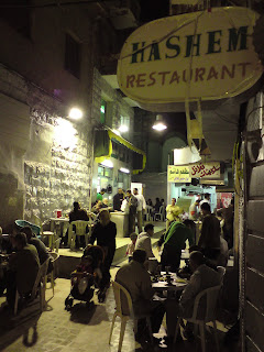 После ядохме най-вкусният хумус на света и некфи салатки в един супер непредставителен, но пълен ресторант (абе 40 квадрата дали имаше и кухнята му беше един барплот с газови котлони). Стените бяха покрити с изрезки от вестници на арабски и английски за ресторанта и собственика му (готвача). Много самобитно, каквото и да значи това ;)